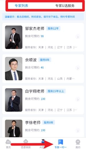 在专家一对一栏目中,您能够浏览专家列表,了解每位专家的服务年限以及覆盖省份,并预约获取个性化指导。