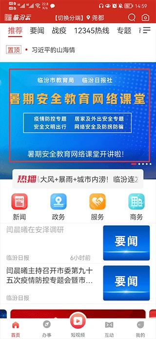 打开临汾云,在首页中点击进入暑期安全教育网络课堂
