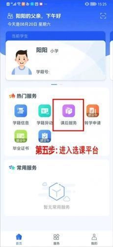 1、注册登录后,在首页中点击课后服务进入选课环节;