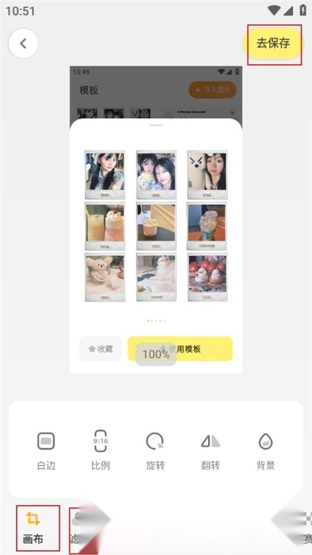 进入编辑界面后,你可以调整画布的尺寸,给图片添加滤镜效果,还能一键插入文字,也可以使用画笔或者马赛克之类的工具;等编辑工作完成了,点击“去保存”按钮就能把图片导出来了。