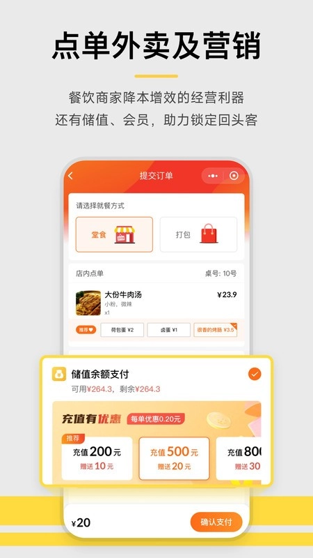 收银、点单、外卖、会员管理,全方位生意助手,一站式解决您的移动支付收款需求,配备强大的店铺会员营销工具,还能拥有专属的外卖与点单小程序,丰富实用功能助力商家提升销售额。
