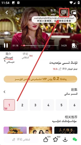 在播放界面点击顶部的【TV】图标,即可开启投屏功能选项,为将内容投射到电视做好准备。