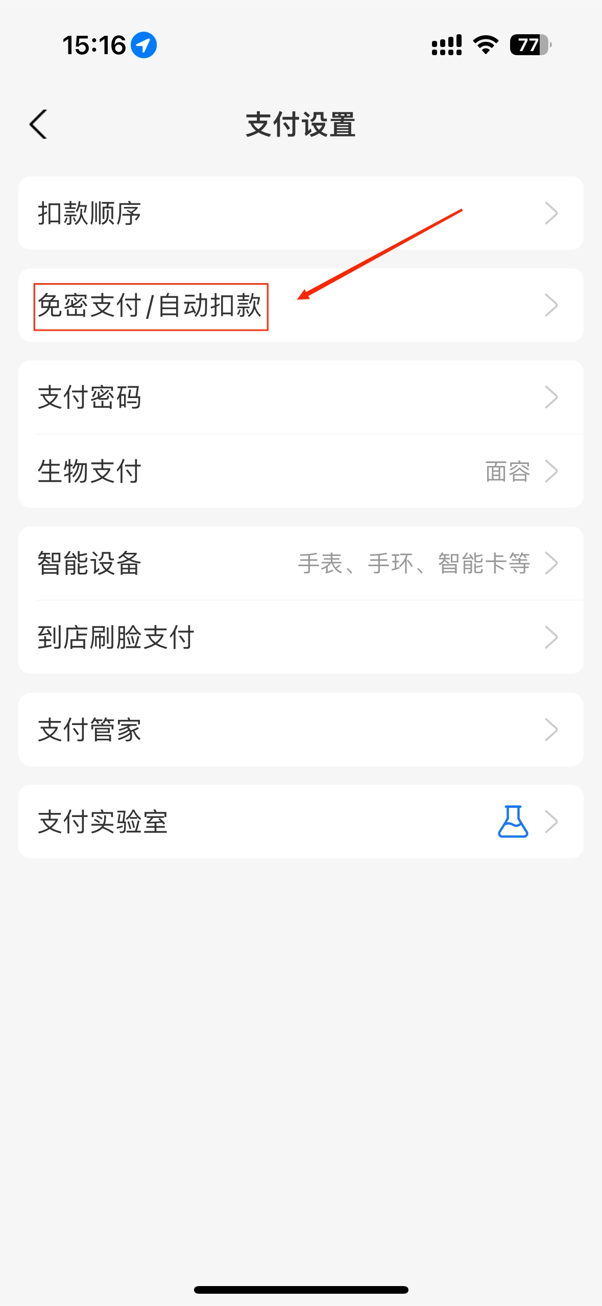 ②进入设置页面后,点击「支付设置」选项,在其中找到「免密支付/自动扣款」相关板块。