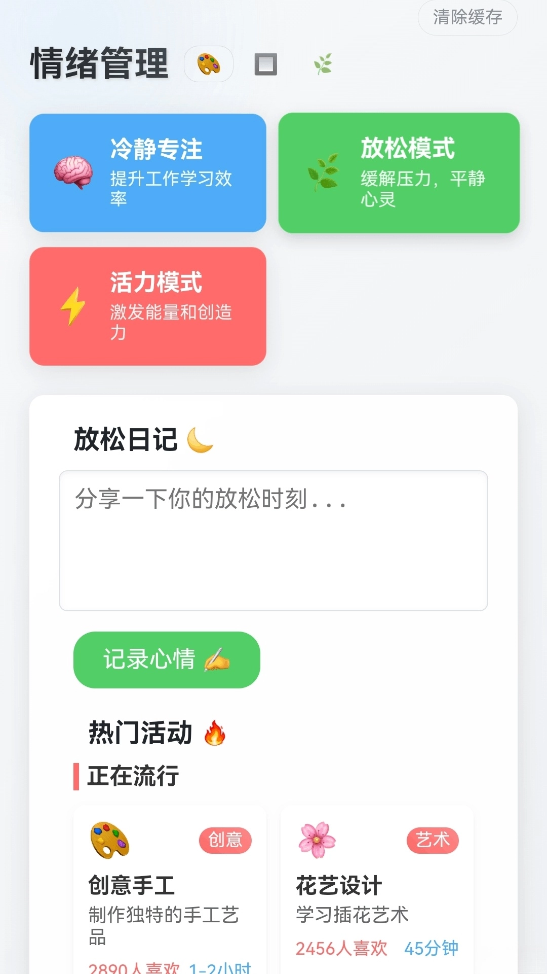 情绪管理模块能让你选择冷静、放松等不同模式,辅助调整自身情绪状态,同时也支持记录每日心情。