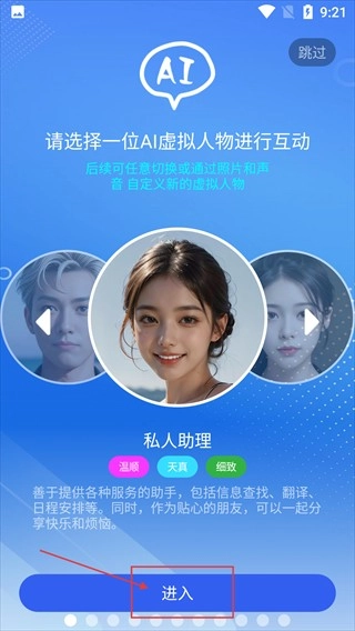 在【AI】虚拟人物选择界面,选定【私人助理】后,点击底部【进入】按钮,即可开启与该AI的互动。