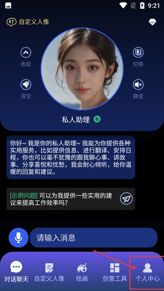 进入AI互动界面后,你可以在【请输入消息】的输入框中发送内容,也可以点击底部的【个人中心】按钮,从而进入到对应的页面。