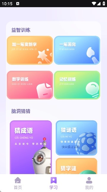 通过游戏化的方式来锻炼逻辑思维、空间想象、分析判断等多种能力。比如说,在脑洞训练板块里,设置了猜成语、谜语、字谜这类充满趣味的猜谜项目。