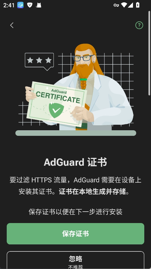 打开AdGuard手机版,在界面里找到并点击“启用”按钮,以此开启HTTPS过滤功能。