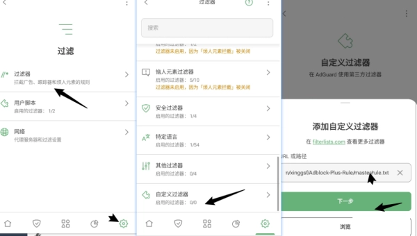 设置>>过滤>>过滤器>>自定义过滤器>>添加自定义过滤器>>导入URL或本地文件>>导入时若不显示txt文件,点击右上角通过文件管理打开。这里补充一些规则,我之前使用的是easychina的规则,其他规则如下: