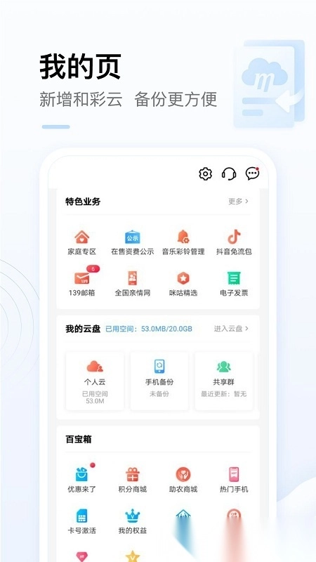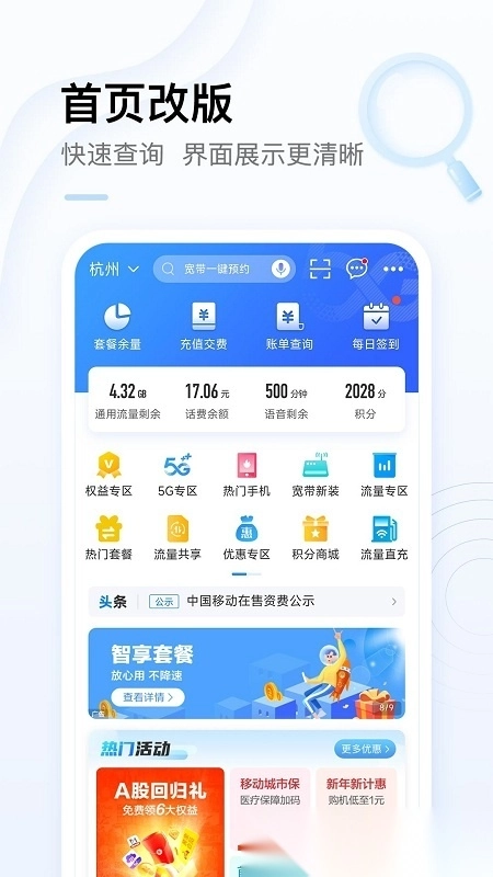 用户可以便捷办理4G套餐、流量加油包、积分兑换等业务,还能订购终端商品,从而精打细算地享受移动生活。