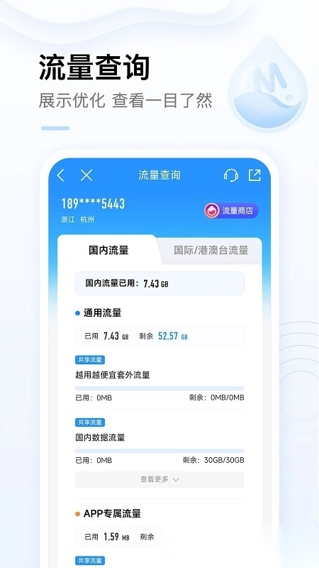 一站式查询实时话费、历史账单、4G流量、积分余额、套餐余量、已订业务及个人信息,数据准确清晰随时可查。