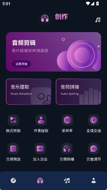音频剪辑处理服务涵盖音乐提取、音频拼接、格式转换、伴奏提取等多种实用功能。