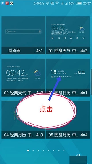 接着在打开的手机小部件列表里,找到想要添加的万年历插件,按照提示,通过拖拽或者点击的方式操作插件。