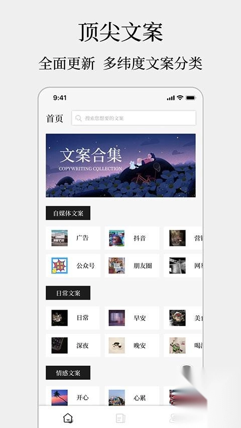 顶尖文案是一款覆盖海量类目的优质文案库软件,应用场景十分广泛。用户能够依据自身需求,获取各类名言美句来摘录或参考,从而让文案创作变得更轻松,既能领略优美的语言艺术,也能学会优雅地表达。
