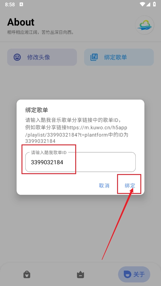 输入歌单的ID,点击"绑定"即可。