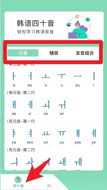进入韩语四十音的学习界面后,你可以自行选择元音、辅音或者发音组合这几种分类,系统会为你提供清晰的发音示例以及对应的对照表。