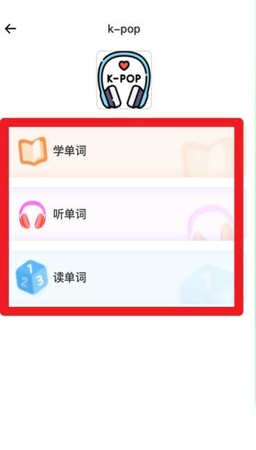 在K-pop学习界面中,你可以自由切换学单词、听单词、读单词这三种模式,以此来满足不同的单词学习需求。