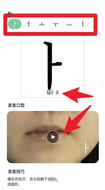 在单个发音学习界面,点击字母旁边的喇叭图标,就能听取发音,还能观看口型视频来学习正确的发音技巧。