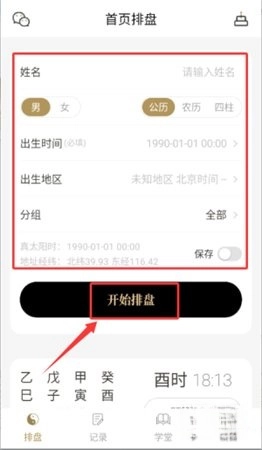 在排盘页面填写姓名与出生时间,点击“开始排盘”按钮即可得到排盘结果。