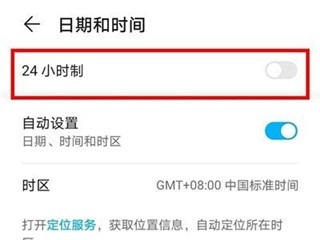 在【日期和时间】页面中,点击开启【24小时制】右侧的开关,即代表24小时制已成功启用。