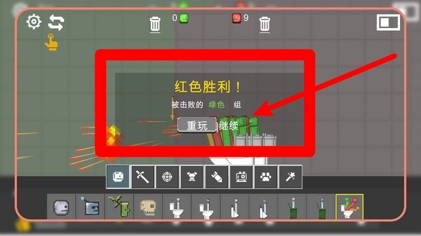 战斗结束后会呈现胜负结果,以红色标识胜利、绿色标识失败,玩家可以选择重玩来继续挑战,也可以选择进入下一局游戏。