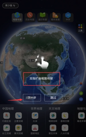双指扩张红框手势区域,缩放地球查看细节。