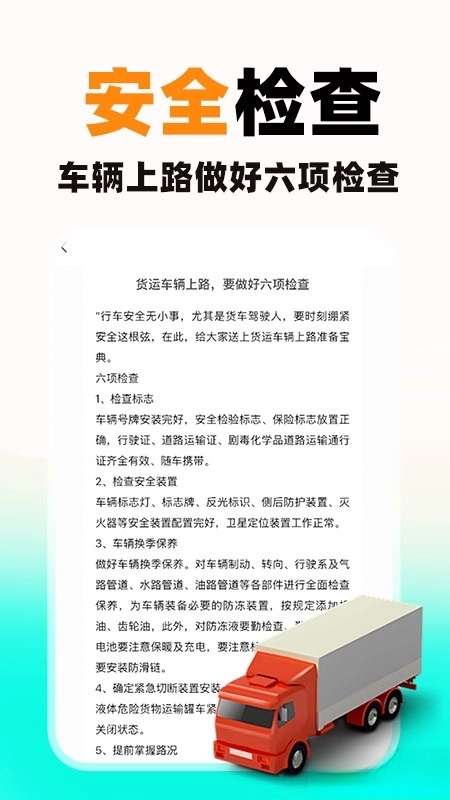 安全检查暖心守护:针对货运行驶途中的各类安全隐患,提供全面细致的安全检查项目。从车辆状态到货物装载,全方位保障司机行车安全,切实提升运输效率,让每一次出行都安心无忧。