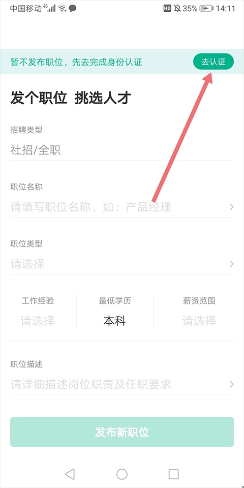 企业老板、业务部门负责人以及HR,都能在本站免费发布招聘信息。完成发布后,只需在手机上安装并登录应用,就能进入身份认证页面。对于企业用户而言,在该页面点击【我要招人才】选项,即可在手机端完成企业招聘认证流程。