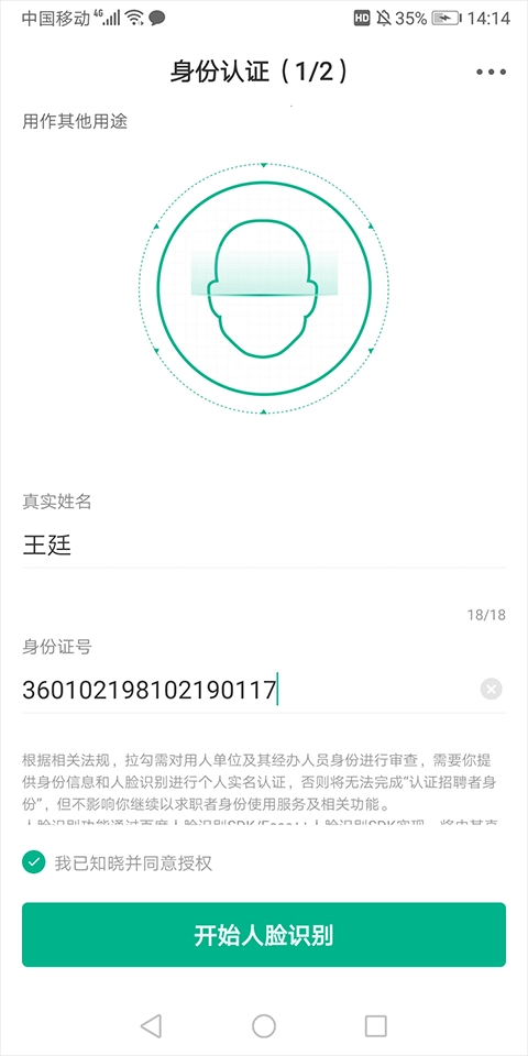在打开的身份认证中,输入真实姓名、身份证号并勾选同意授权后点击【开始人脸识别】。人脸识别完成后即可上传企业相关信息,以及上传企业营业执照完成整个认证流程