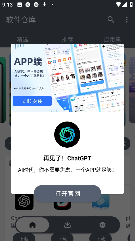 打开软仓App的首页,能看到精选、推荐以及应用集这几个板块。