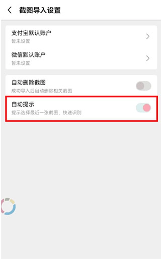 在进行导入操作前,请先完成相关设置:进入【截图导入设置】中的【自动提示】选项进行配置,完成设置后系统将自动识别刚刚截取的微信账单。