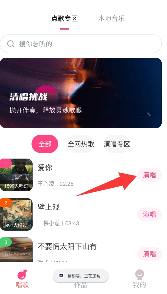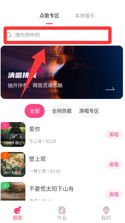 点击红色框框的搜索栏搜索你想听的歌曲。