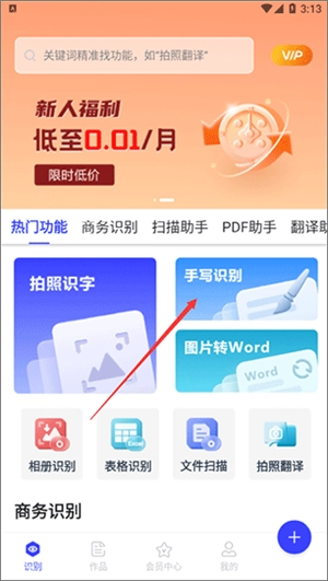 打开软件后,能看到拍照识字、手写识别、文件扫描等实用功能,这里以手写识别功能为例进行说明。