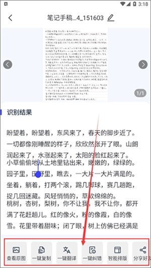 随后即可获取图片里的文字信息,还能对这些信息进行编辑,或者一键完成复制、翻译、纠错、排版等操作。