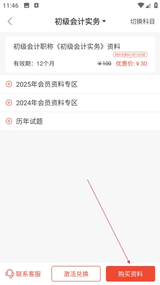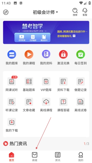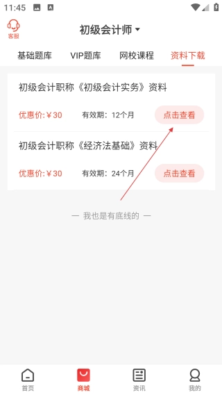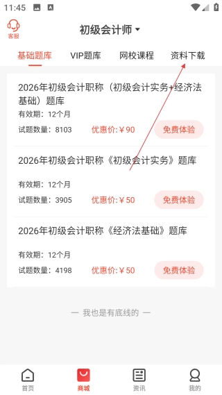 在初级会计师板块,点击首页底部的【商城】按钮,即可进入课程与资料的选购页面。