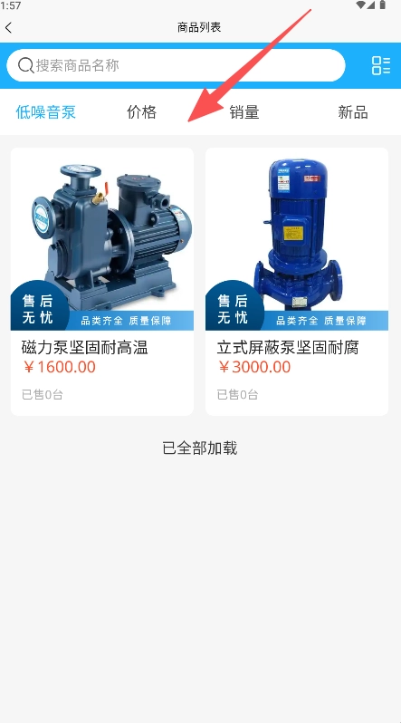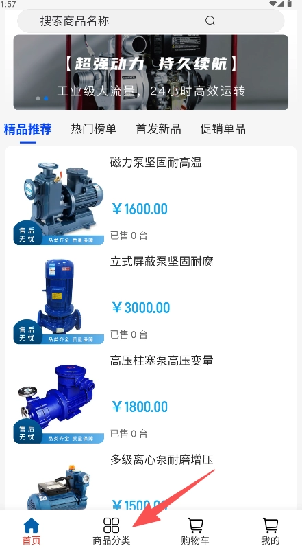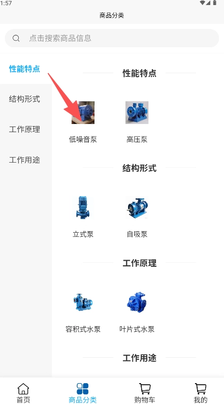 在分类页面左侧选择分类后,右侧会展示出对应的商品类别,例如“低噪音泵”这类。
