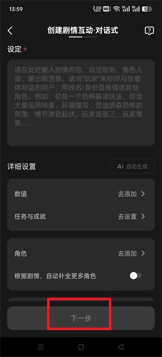 2、紧接着来到创建界面,我们可以去进行一些功能的设定,填写自己的需求,然后点击【下一步】;