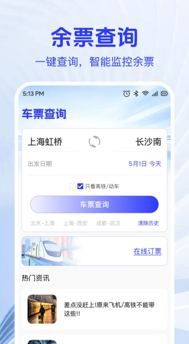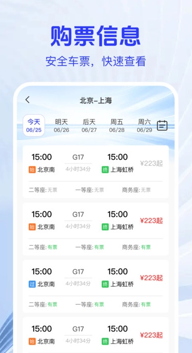 火车高铁票查助手是一款专注于铁路出行的智能查询与购票平台,它让用户彻底告别车站排队的烦恼。只需输入目的地和出行日期,系统就会立即呈现所有可用车次、余票情况及实时票价,新用户还能查看详尽的购票攻略指导,从班次选择到在线支付全程流畅便捷,是您高效规划行程的得力出行伙伴。