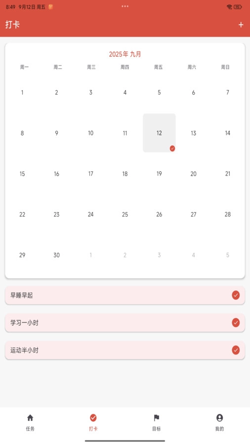 点击下方打卡功能,可以按照日期进行打卡记录;