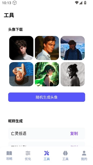 游咔盒子安卓版是一款功能丰富的手机实用工具,在这里你不仅能查询王者荣耀、大话西游等热门游戏的攻略玩法,还能调整屏幕画质、一键修改120帧等,此外,各类好听的昵称、好看的角色头像也能自由生成,为你带来更多乐趣,感兴趣的小伙伴快来游咔盒子安卓版体验吧。