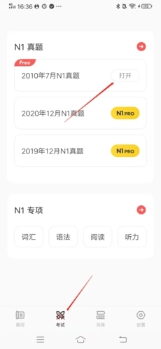 进入MOJiTEST后,先点击底部的“考试”选项,接着在页面上方选择你想参加的是考试还是测试。