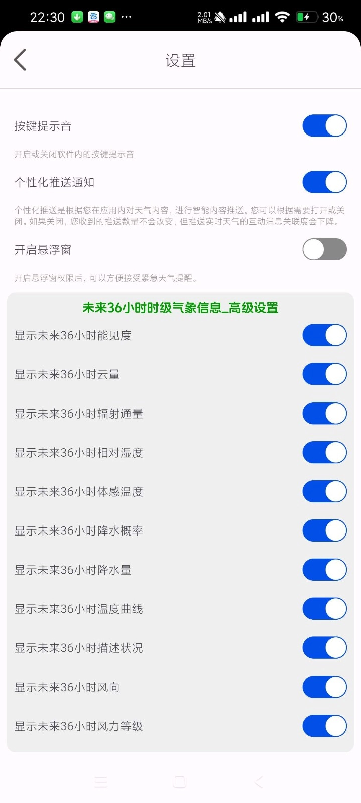 在主界面上,能看到当日的实时天气情况,涵盖温度、湿度、气压、风速、风向等信息。