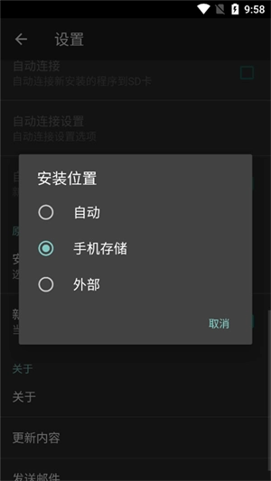 系统会弹出一个名为“安装位置”的对话框,其中包含“自动”“手机存储”和“外部”三个选项,用户可根据自身需求选择合适的选项。