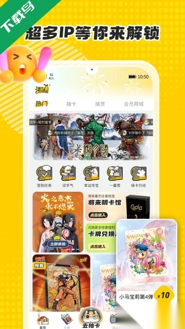 卡游术铂整合当下热门IP资源,不仅支持用户在线抽取卡牌,还提供了丰富的卡片及周边交易服务。用户可以轻松获取心仪的IP卡片,参与各类兑换活动,在购物过程中感受乐趣与卡牌文化的深度融合。作为新兴品牌,它秉持纯粹经典的理念,旨在引导用户体会收集与交换卡牌所带来的独特趣味。