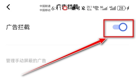 把广告拦截功能的开关按钮向右滑动到开启状态,马上就能体验到清爽的浏览感受。