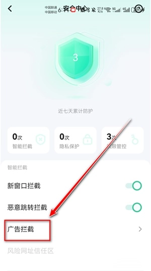 在安全功能列表中,定位并选择"广告拦截"功能项。