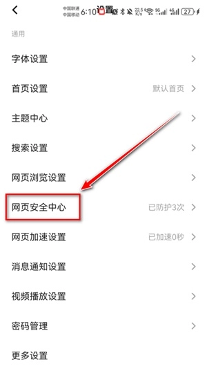 通过滑动操作找到并点击“网页安全中心”选项,即可进入安全防护功能模块。