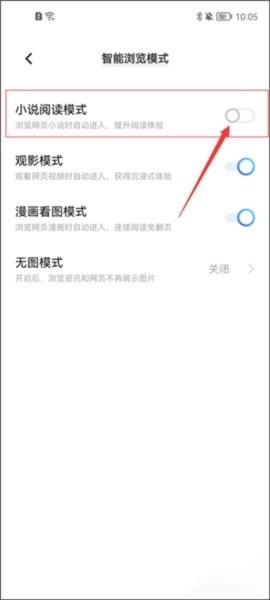 找到“小说阅读模式”的功能开关,把它切换到关闭状态,就能取消自动进入阅读模式的功能了。