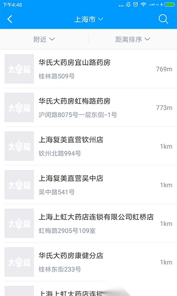 周边药店搜索功能,可查找附近药店的具体位置,并展示实时的距离信息。