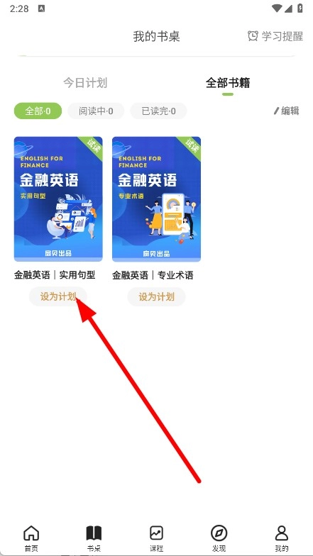 回到我的书桌页面,找到对应书籍,点击其下方的“设为计划”按钮,即可将该书籍添加至学习计划中。